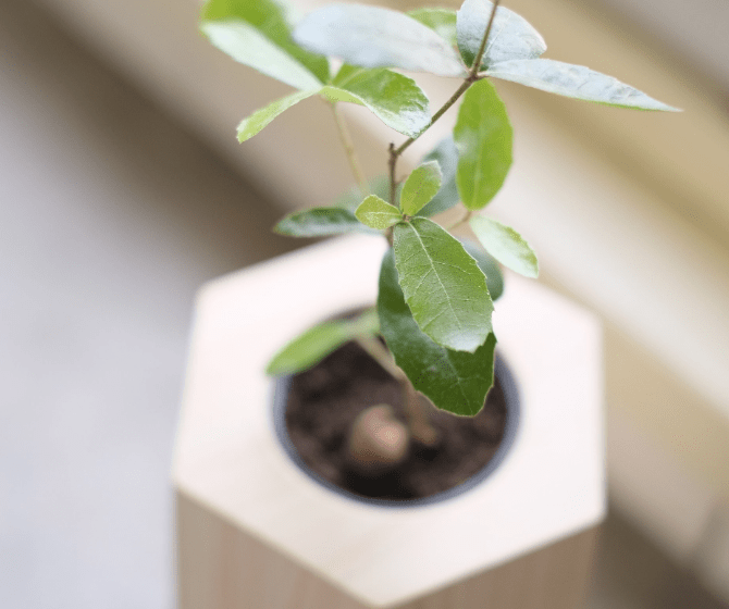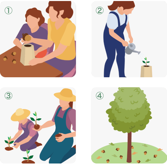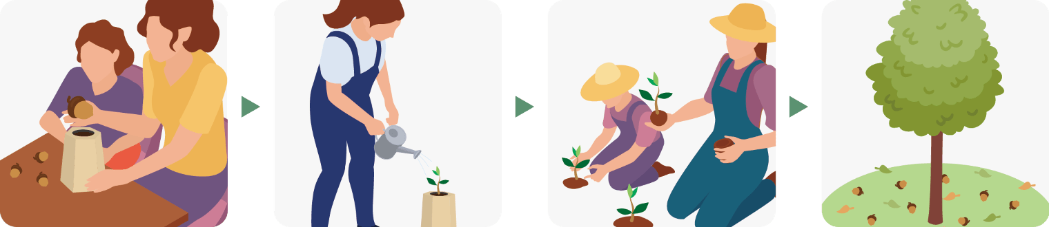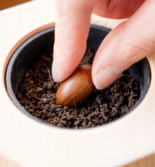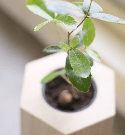 は「2年間」という決められた時間の中で、どんぐりから木を育て、自身で育てたきを森に帰す新しいカタチの観葉植物です。